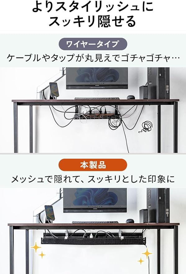 【見た目すっきりな 配線隠し 】メッシュタイプなので、タップや ケーブル 類を隠しつつもすっきりとした印象にすることができます。さらに落ち着いた 黒 色のデザインで、デスク周りに違和感なく設置できます。