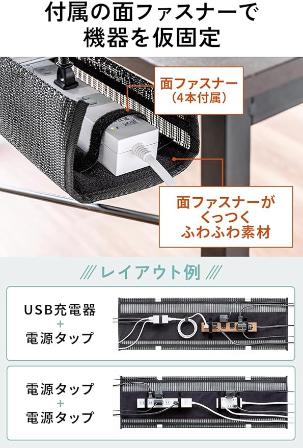 【タップ固定可能な面ファスナー付き】付属の面ファスナー(4本)を使用することで機器を固定して使用することができます。底全体がファスナーをくっつけられる素材になっているため、お手持ちの機器に合わせて自由に配置することができます。