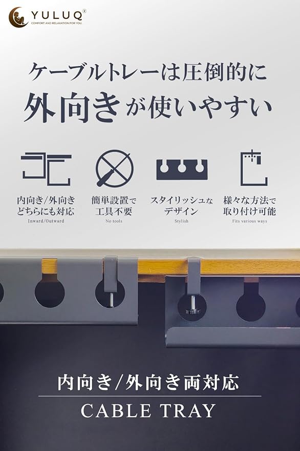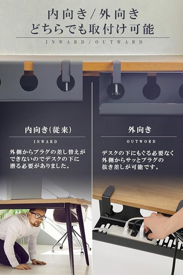 そこでこのケーブルトレーは、外向き・内向きの両対応設計を採用。使用環境や好みに合わせて自由に選べる仕様になっています。
