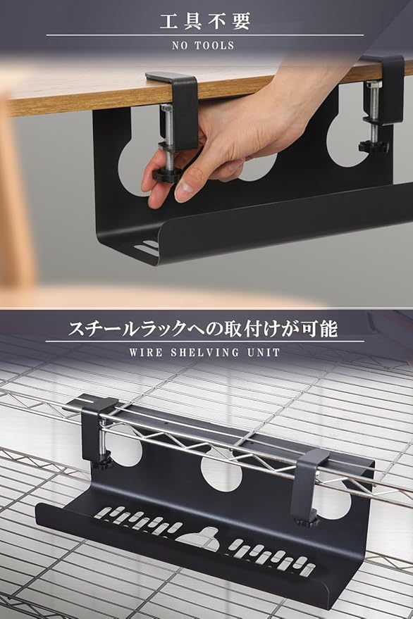 ✅【高い取り付け自由度】このケーブルトレーの最大の魅力は、自由度の高い取り付け設計です。1.【取り付けの向き】外向き・内向きのどちらにも設置可能。2.【取り付け方法】クランプ式またはネジ式を選べるので、工具を持っていない方でも簡単に取り付けられます。3.【取り付け場所】デスクはもちろん、スチールラックなど多少の段差がある場所にも対応できます。4.【クランプ位置】両端2か所または中央1か所など、設置場所に合わせて柔軟に調整できます。5.【デザイン性】シンプルでスタイリッシュなデザインが、どんなインテリアにも自然に馴染みます。6.このようにユーザーのアイデア次第で取り付け方や場所を自由にアレンジ可能。使用環境を選ばず、幅広いニーズに応えるケーブル収納トレーです。