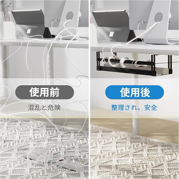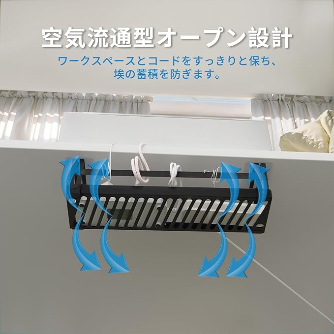 【優れた通気・防塵機能】デスクケーブル収納ケースの底面は中空構造を採用し、効果的な空気循環を実現します。これにより、ケーブルや機器から発生する熱を素早く分散し、異常発熱のリスクを大幅に低減。オープンデザインにより埃の堆積を防ぎ、安全で快適な作業環境を維持できます。デスク下ケーブルバスケットは電源ケーブル・データケーブル・A/V ケーブルを一括整理可能。幅 43cm の大容量設計で、大型機器のケーブルもストレスなく収納できます。