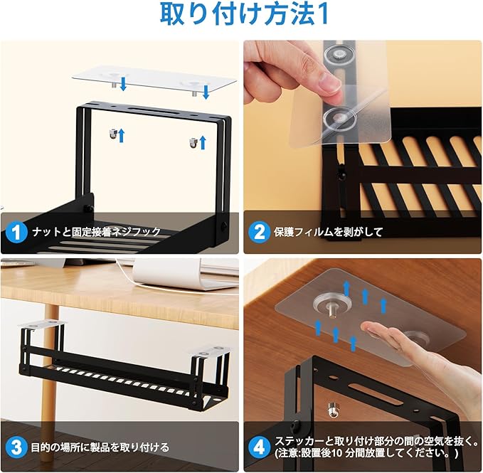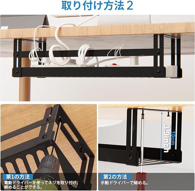 【2WAYの取り付け方法】デスク下用ケーブルラックは、接着ネジ(耐荷重 2.5kg)またはネジ(耐荷重 6kg)の 2 通りの取り付け方法を選択できます。複数のコンセントや多数のケーブルに適しています。テストによると、どちらの方法も日常の使用に適しており、取り付けは簡単で数分で完了します。