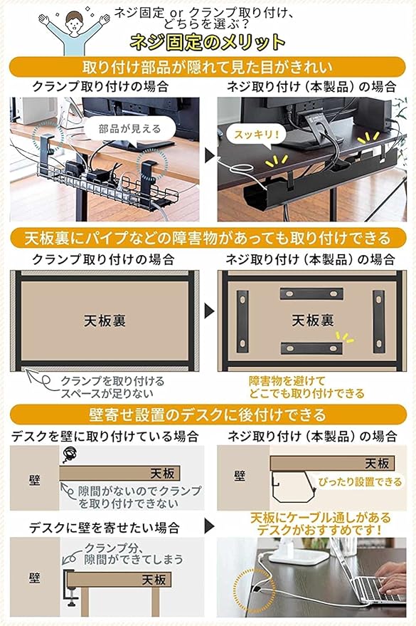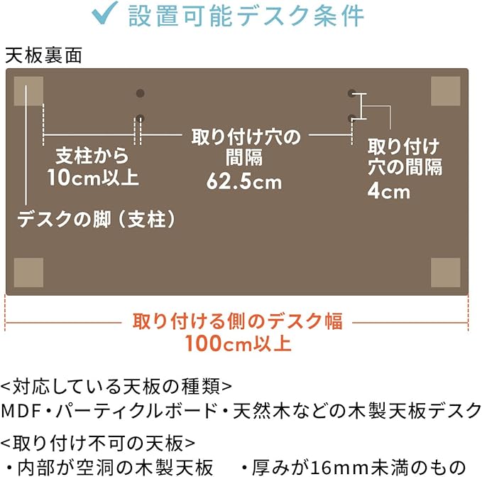 【重要・ご注意】ご購入前に商品画像の「設置可能デスク条件」を必ずご確認ください。ご購入後に、サイズが合わず取り付けできない というお問い合わせをいただくケースがございます。お手持ちのデスクに取り付けできるか(設置時サイズ・取り付けの際にデスクの天板裏に干渉物がないかなど)、あらかじめご確認のうえご購入くださいますようお願いします。