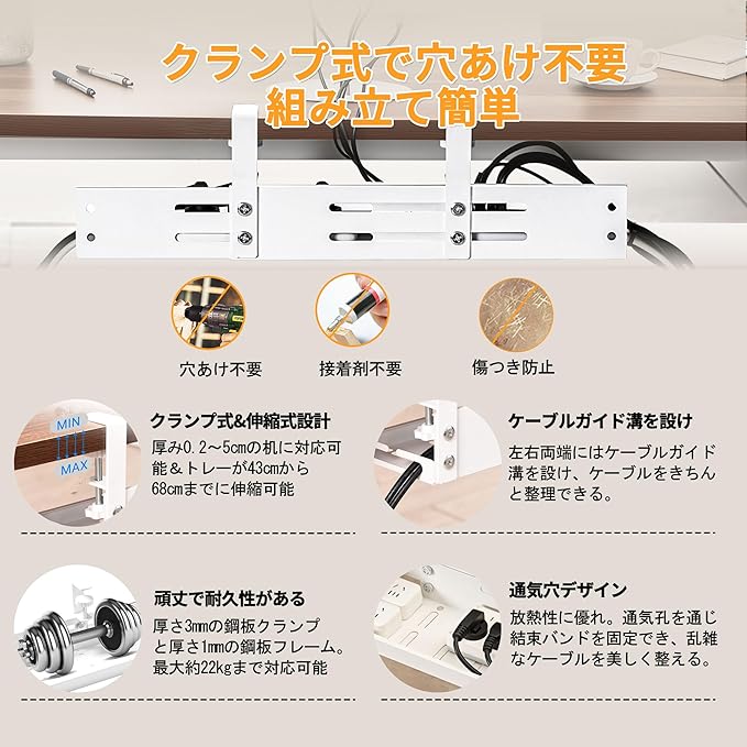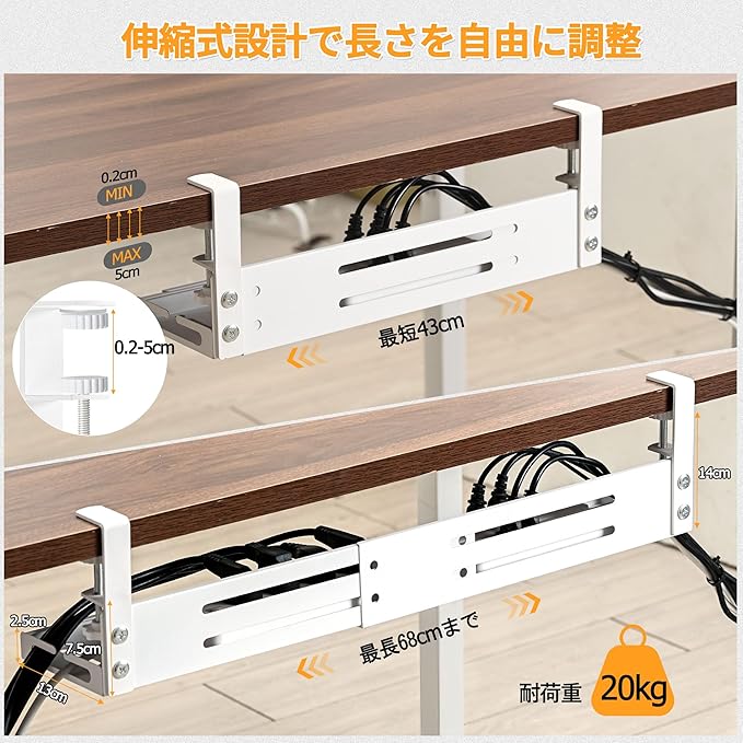 【商品仕様&品質保証】■ 材質:スチール■ サイズ:最短43cm/最長68cm/高さ約14cm/奥行約13.0cm/底面高さ約2.5cm■ 耐荷重:約20kg■ 適合机厚:0.2~5cm■万一欠品や破損があっても、Amazon注文履歴から出品者へ即時連絡可能。図解付き取扱説明書付きで、安心して【デスク周り収納】【配線隠し】を始められます。