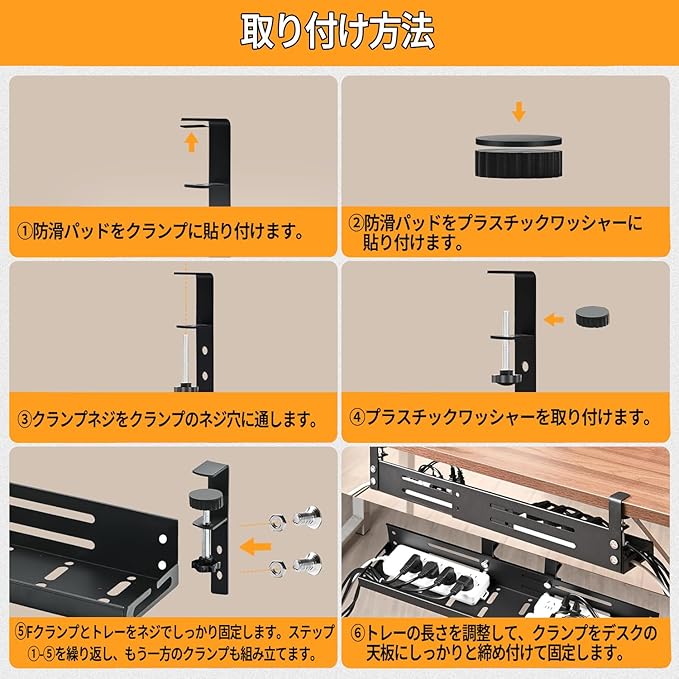 【クランプ式で穴あけ・接着剤不要、簡単に組み立て可能】ケーブルトレー クランプは両側のクランプで机縁にしっかり固定。ドリルや接着剤は不要で、傷をつけずに設置できます。六角レンチや付属のドライバーでネジを締めるだけのシンプル組み立てで、初心者でも安心。デスク周り収納に最適です。