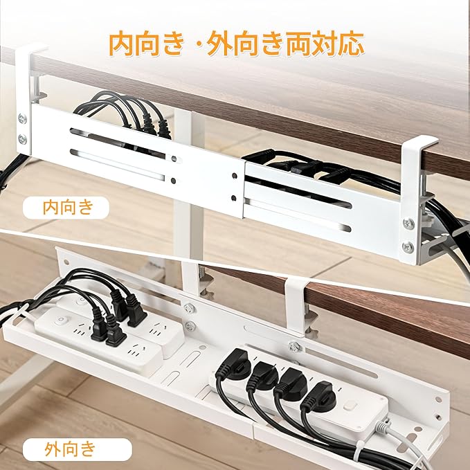 【伸縮式設計で長さ自在調整、内向き 外向き両対応】最短43cmから最長68cmまで伸縮可能なので、コンパクトなUSBハブから大型電源タップまでジャストフィット。さらに机の厚み0.2~5cmに合わせて調節可能で、配線隠し効果が高く、デスク下に散らばりがちな電源コードやケーブルをすっきり整理・収納できます。