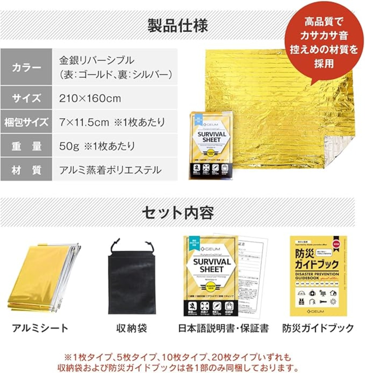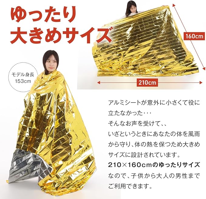 【商品詳細・スペック】 - カラー:金銀リバーシブル(表:ゴールド、裏:シルバー) - サイズ:210 160cm(大判サイズ) - 梱包サイズ:7 11.5cm(1枚あたり) - 重量:約50g(1枚あたり) - 材質:アルミ蒸着ポリエステル - セット内容:アルミシート、収納袋、防災ガイドブック(日本語) ※1枚タイプ、5枚タイプ、10枚タイプ、20枚タイプ、いずれも、収納袋および防災ガイドブックは各1部のみ同梱しております。
