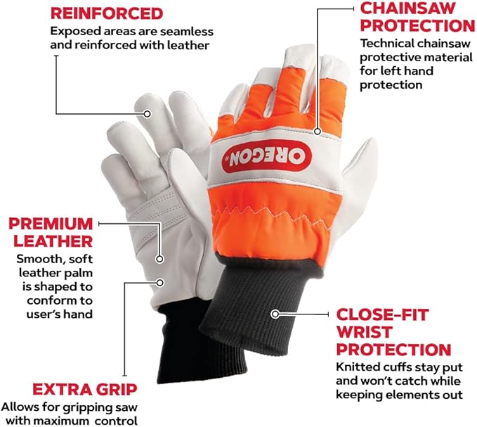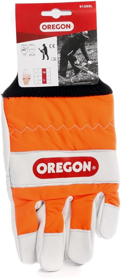チェンソー作業用グローブ Lサイズ。オレゴンのチェンソーグローブは厚く丈夫なレザーを使用し、耐切断性で怪我等のリスクが高い左手を守りながら、手の平の作業面は防水素材で滑らず安全。作業がしやすく着け心地の良い、安全性に優れた作業用手袋。 S-Lサイズ有り。使用前にはグローブの説明書と機械の説明書を確認してください。