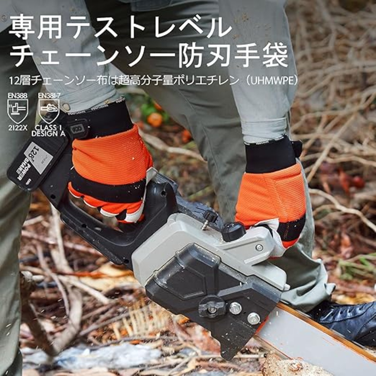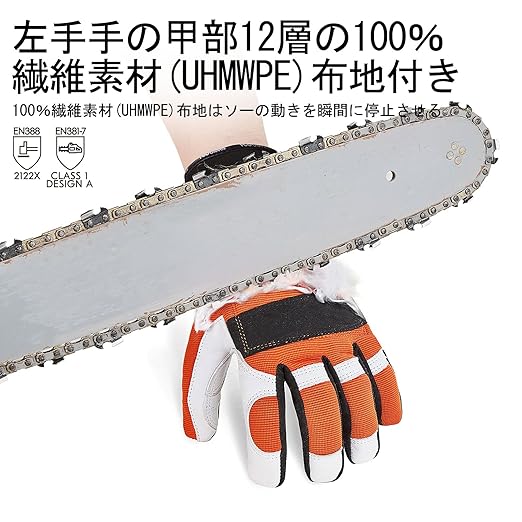 【チェーンソー保護用高強度防刃】 左手の甲の部分はさらに特別な保護層を施し、チェーンソーから左手を保護し、EN381-7規格、クラス1.25m /s
