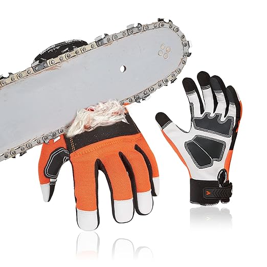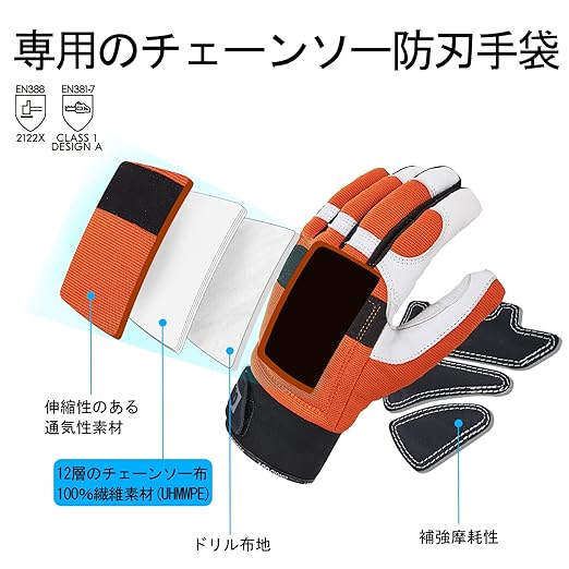 [Vgo...] チェーンソー手袋 防振手袋 メカニックグローブ 作業用手袋 軍手 羊革 掌当て付き 振動軽減 防刃 防護用 滑り止め 左手の甲に12層チェーンソー止め布付き EN381-7規格 レベル1 林業 伐採 草刈り (1双入,L,オレンジ―GA8912)