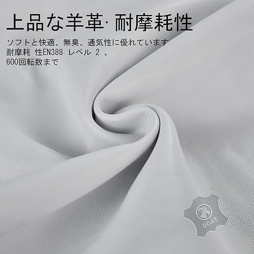 【手の掌側&甲側&袖口】伸縮性のある。伸縮性のあるスパンデックス素材にも優れた柔軟性と通気性を提供し、フィット感抜群です。耐久性を高めるために、羊革のストライプを採用します。同時に指が動く時のフレキシビリティも向上します。袖口は手首にぴったりとフィットすることで、手袋の内側に汚れや破片が入らないようにします。バンド付きの伸縮性のある袖口が何時でも調節できます。