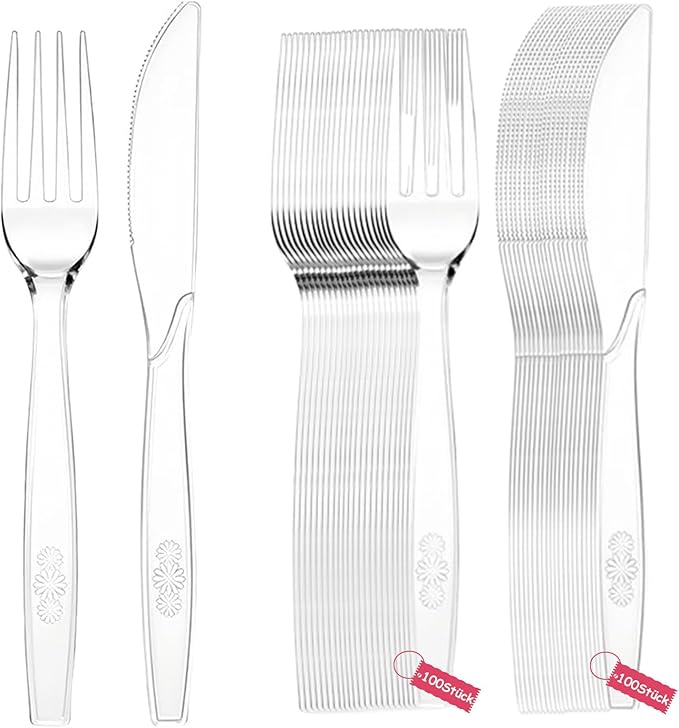 プラスチック製カトラリー200点セット100本透明プラスチッ クフォーク100本 プ ラスチックナイフ 使い捨て 食器 セット 結婚式 誕生日 ピクニックバーベキューやビュッフェ用の使い 捨て食 器(透明)