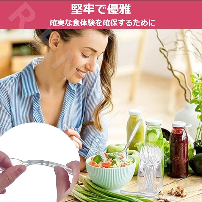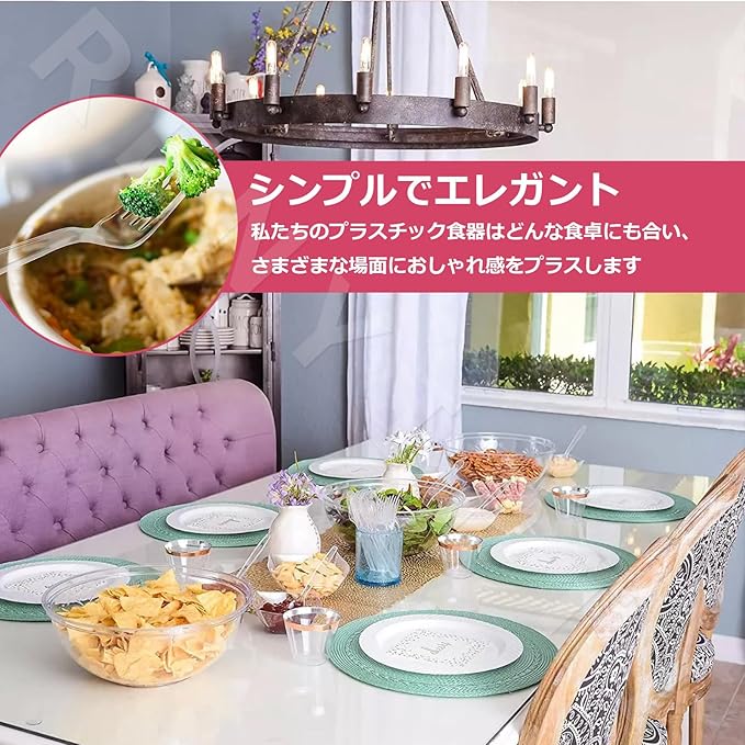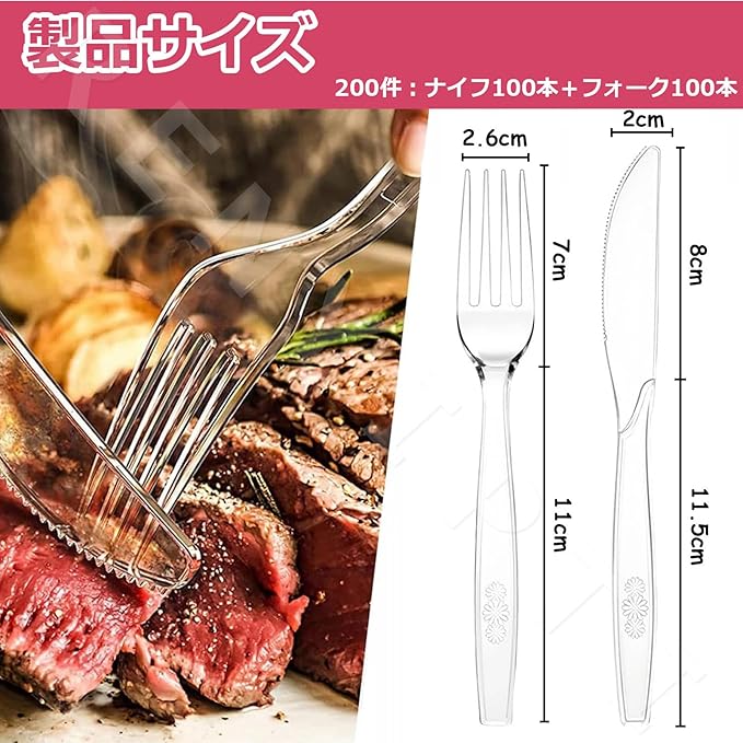 【耐久性と安全性】透明プラスチックナイフとプラスチックフォークは高品質のPPプラスチックで作られており、長寿命です。【プラスチック料理セット】製品は100個のプラスチックフォーク、100個のプラスチックナイフで構成され、あらゆるパーティーで使用することができ。【パーティー用のプラスチック製カトラリー】通常のランチ、お子様のお弁当箱、ピクニック、旅行やキャンプなど、日常の使用にも簡単に組み込むことができます。【簡単お手入れ】プラスチック製のフォークとスプーンは使い捨てで、食器洗いの時間を節約できます。 結婚式、ビュッフェ、利便性が重要な集まりに適しています。【多用途】家庭、ホテル、レストラン、パーティー、ケータリング、家族の食事など、パーティー用品に最適です。 手間いらずのホスティングのために買いだめしましょう。