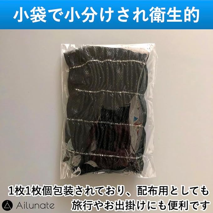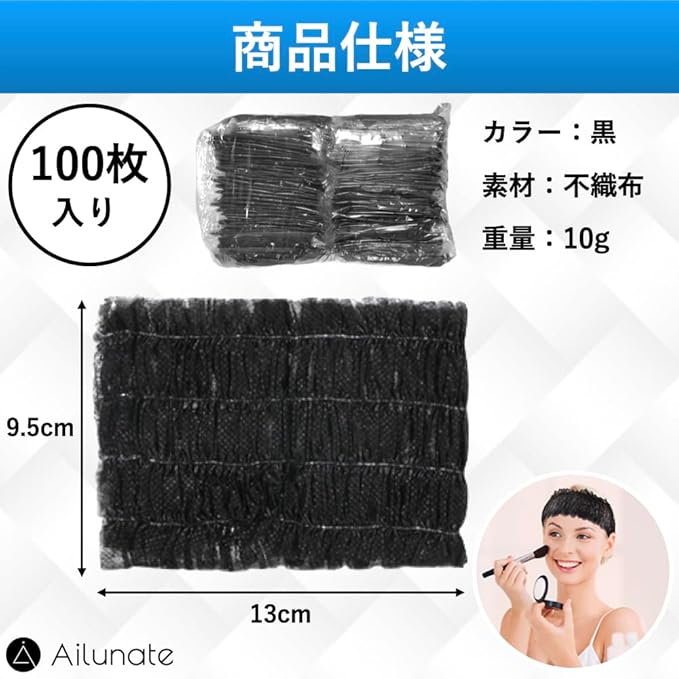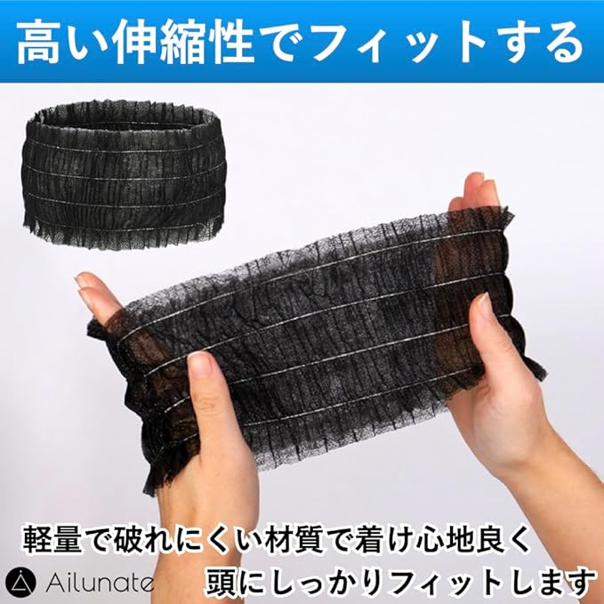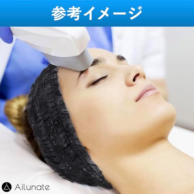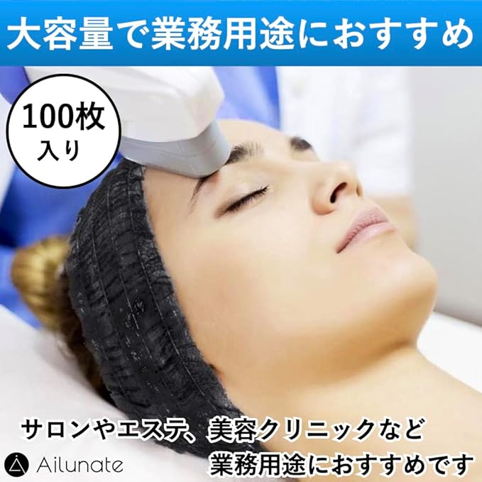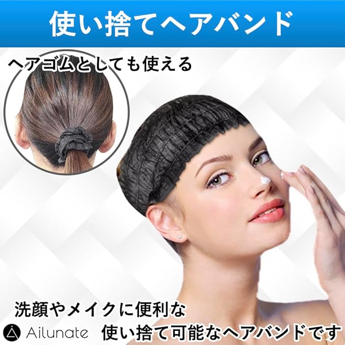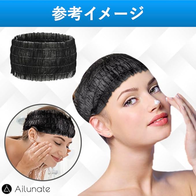 Ailunate ヘアバンド 使い捨て 個包装 ヘアキャップ 100枚 ヘアターバン ヘッドバンド 不織布 洗顔 化粧 大容量 業務用 ブラック 黒