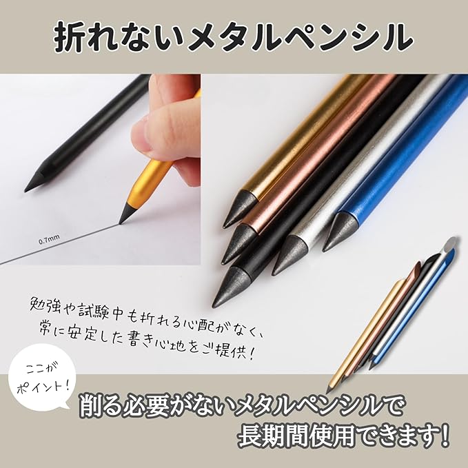 【折れないメタルペンシル】削る必要がないメタルペンシルで、長期間使用可能。勉強や試験中も折れる心配がなく、常に安定した書き心地を提供します。ペン先は約0.7㎜、HB相当の濃さで便利です。