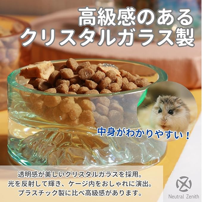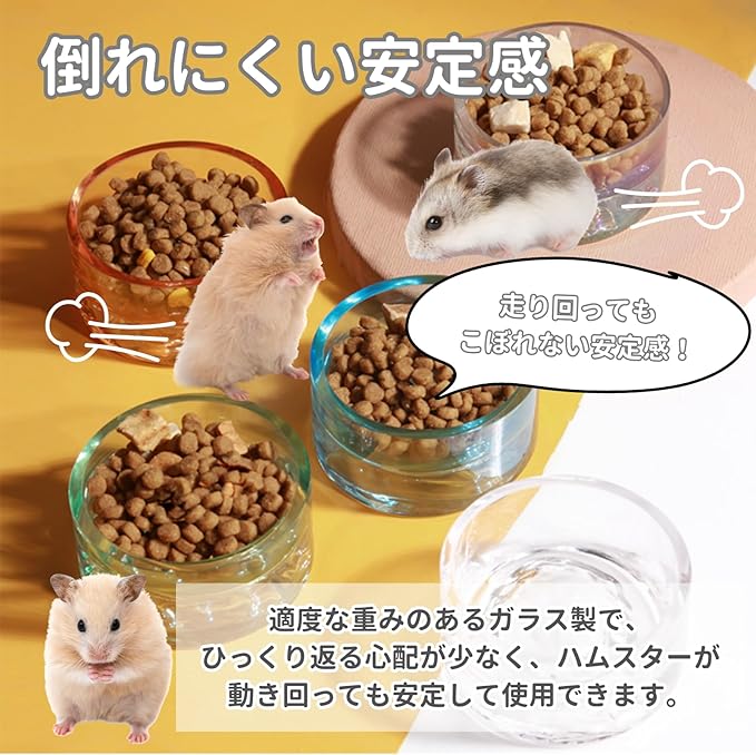 【安定感があり倒れにくい】適度な重みのあるガラス製で、ひっくり返る心配が少なく、ハムスターが動き回っても安定して使用できます。
