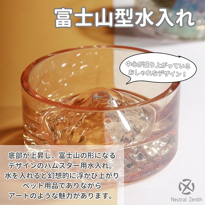 【富士山型水入れ】底部が上昇し、富士山の形になるデザインのハムスター用水入れ。水を入れると幻想的に浮かび上がり、ペット用品でありながらアートのような魅力があります。