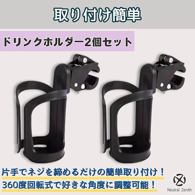 【取り付け簡単】工具不要で簡単に取り付け&取外しが出来るドリンクホルダーです。 取り付けは片手でネジを締めるだけの簡単取り付け。360度回転式でお好きな角度に調整でき、取り付け径も調整可能です。クリップ式ボトルホルダーですので取付箇所を傷つけません。2個セットでのお届けになります。