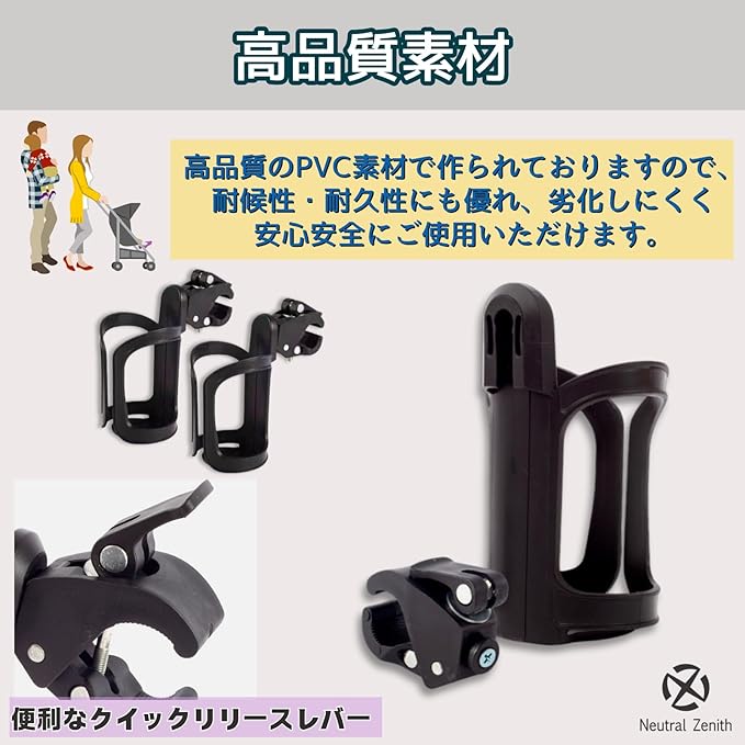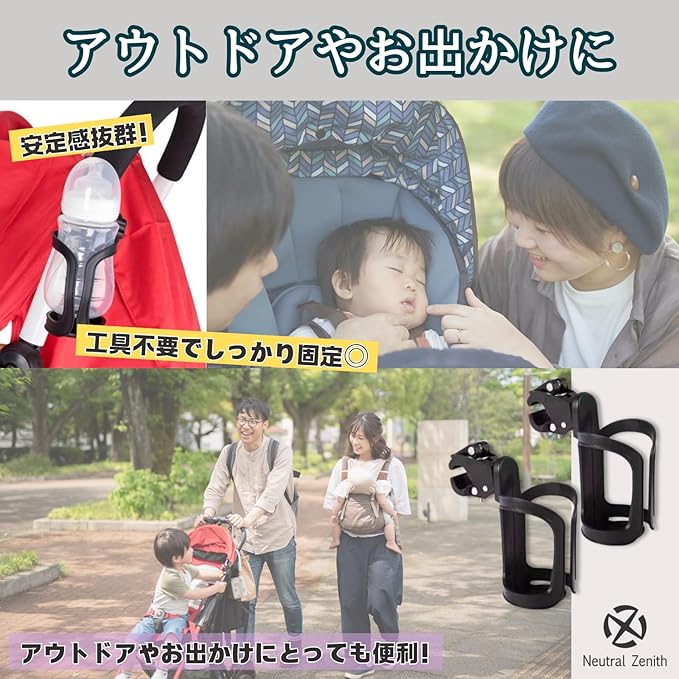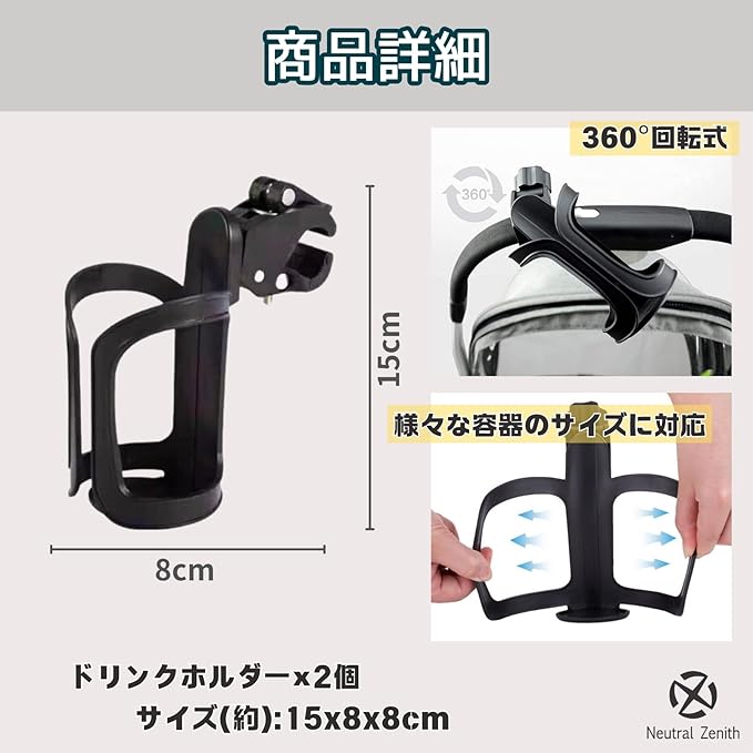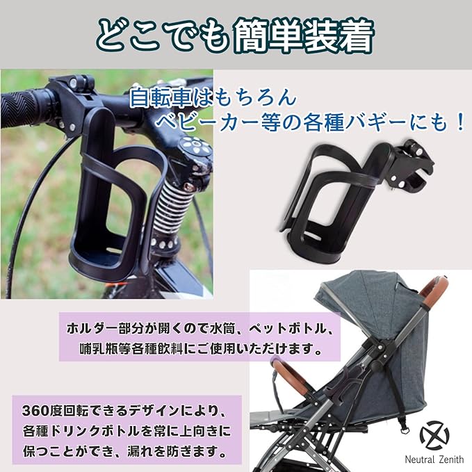 【どこでも簡単装着】自転車はもちろん、ベビーカー等の各種バギー、三輪車の手押し部分、スーツケース、車椅子など、どこにでも取り付けることが可能です。パイプ部分に簡単に装着できるのでハンドル、サドル、ベビーカーのパイプなど幅広くご使用になれます。ホルダー部分が開くので水筒、ペットボトル、哺乳瓶等各種飲料にご使用いただけます。360度回転できるデザインにより、各種ドリンクボトルを常に上向きに保つことができ、漏れを防ぎます。