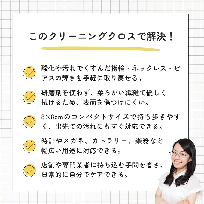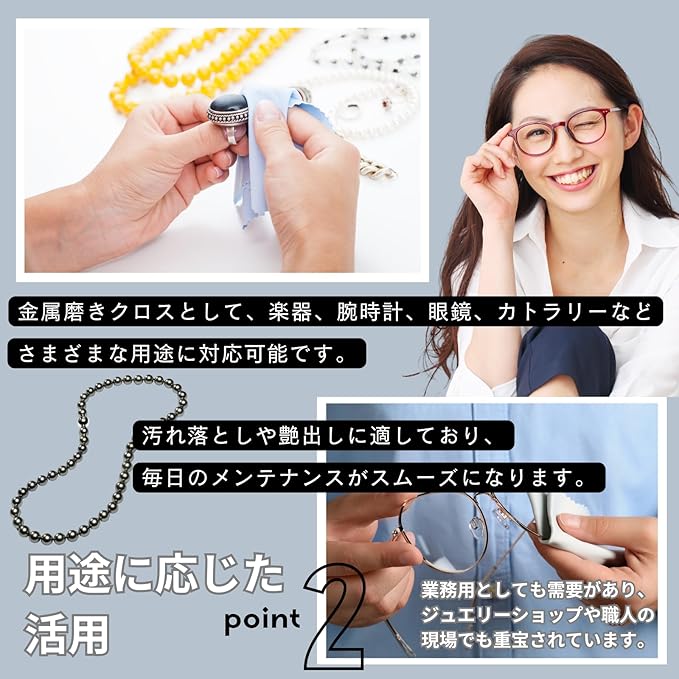 【用途に応じた活用】 金属磨きクロスとして、楽器、腕時計、眼鏡、カトラリーなどさまざまな用途に対応可能です。汚れ落としや艶出しに適しており、毎日のメンテナンスがスムーズになります。業務用としても需要があり、ジュエリーショップや職人の現場でも重宝されています。