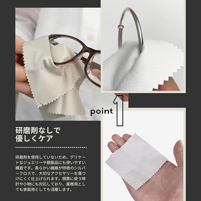 【研磨剤なしで優しくケア】 研磨剤を使用していないため、デリケートなジュエリーや銀製品にも使いやすい構造です。柔らかい繊維が特徴のシルバークロスで、大切なアクセサリーを傷つけにくく仕上げられます。頻繁に使う時計や小物にも対応しており、業務用としても家庭用としても活躍します。