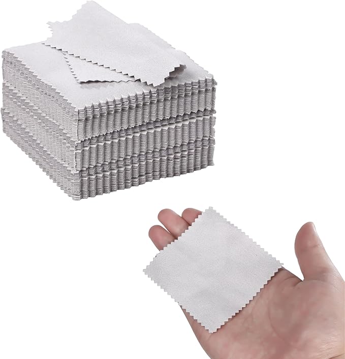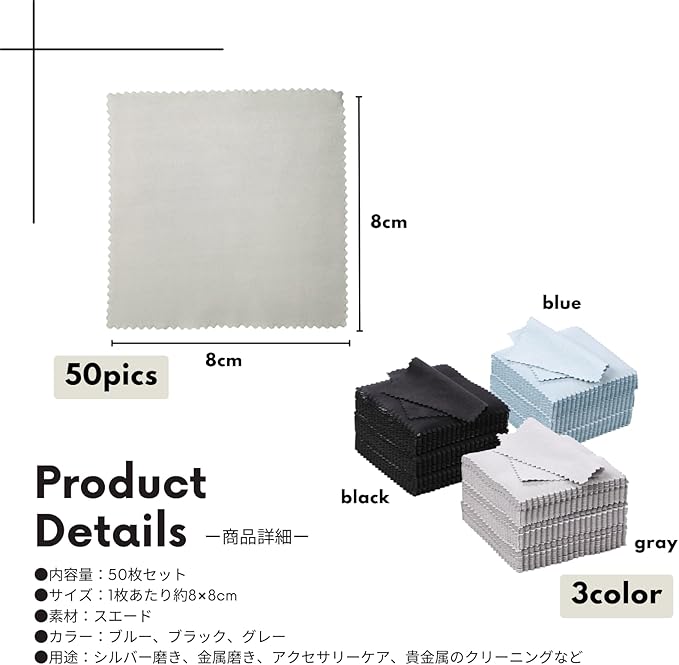 【商品詳細】 内容量:50枚セット サイズ:1枚あたり約8 8cm 素材:スエード カラー:ブルー、ブラック、グレー 用途:シルバー磨き、金属磨き、アクセサリーケア、貴金属のクリーニングなど