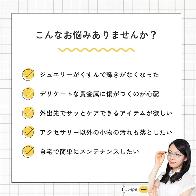 【ジュエリーに輝きを】 ジュエリーや貴金属のくすみや汚れを拭き取り、本来の輝きを引き出すクリーニングクロスです。金属磨きやシルバー磨きに適しており、アクセサリーの手入れを自宅で手軽に行えます。指輪やネックレス、ピアスなど幅広いアイテムに対応しており、見た目を美しく保ちます。
