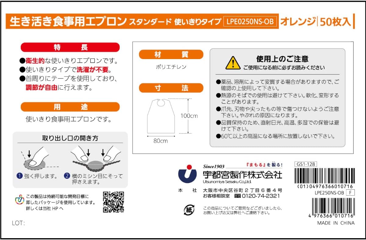 宇都宮製作所 生き活き食事用エプロン使い切りタイプ オレンジ 50枚入