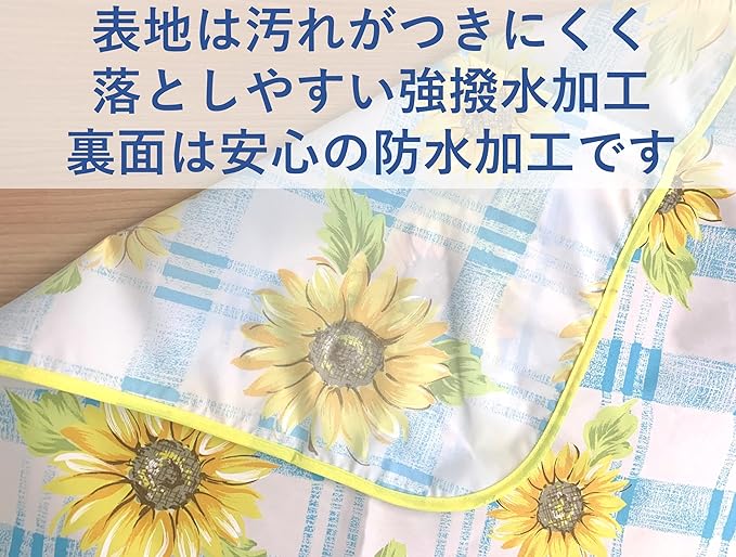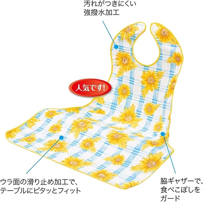 テーブルからすべらない食事エプロン ひまわり柄 ハビナース 裏面すべり止め加工 テーブルにピタッとフィット 強撥水加工 脇ギャザーで食べこぼしガード 食べこぼしが多い方に 介護用 大人用 108 78cm 1018249