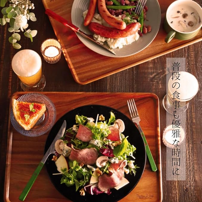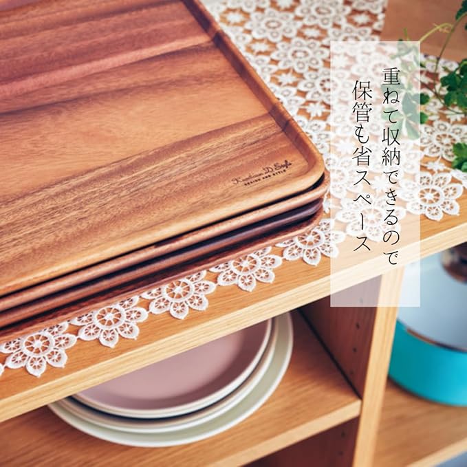 毎日の食事や軽食シーンで使いやすい実用性の高い定番の木製トレー。プレートやボウル、カップをまとめて載せられるサイズ感で、配膳や後片付けをスムーズに行えます。 シンプルで主張しすぎないデザインのため、和食・洋食どちらの食器とも相性が良く、朝食・ランチ・ティータイムまで幅広く活躍します。軽くて扱いやすく、日常使いで出番が多いのも特長。