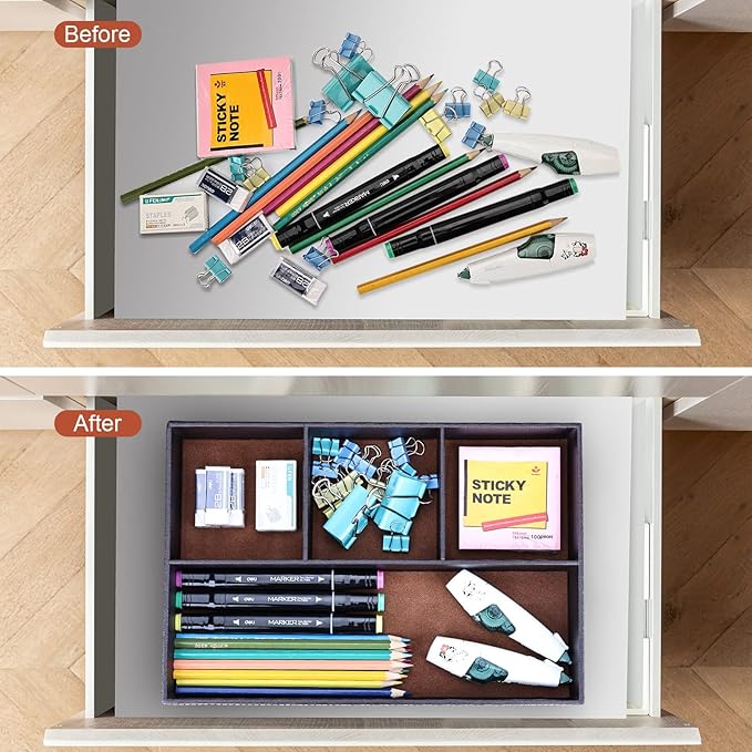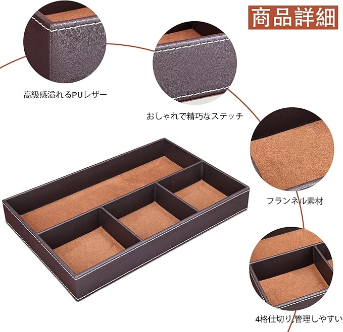 「優れた素材」本製品の外表面は高品質のPUレザーで作られています。内部はMDF構造で丈夫で長持ちします。内装と底面はフロッキー加工された裏地採用し、手触りが柔かくて入れたものを傷から守ります。高級感のある質感とシンプルなデザインで幅広く利用できるデスクオーガナイザー/机上用トレーです。