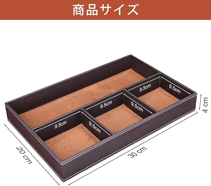 「商品サイズ」本体:30cm 20cm 4cm、A4サイズ相当の大きさに、内径29.5x9.5cmの仕切りが1つと9.5x9.5cmの正方形の仕切りが3つの構成、トレーの深さは3.5cmです。異なる収納仕切りが4つあり、家の中の目立たない小物を一か所にまとめて、探すストレスを解消、デスクの周りもスッキリ!