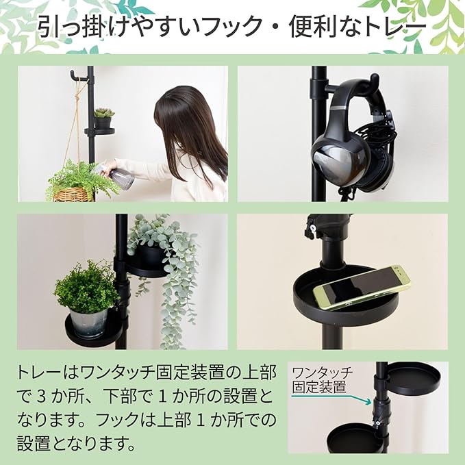 山善(YAMAZEN) 突っ張り ラック ポールハンガー プランタースタンド 設置簡単 (トレー4個・フック1個付き) ワンタッチ突っ張り (実用新案取得済) 幅30 奥行30 高さ190-260cm フラワースタンド ボタニカル 室内 組立品 マットブラック WJE-12RM(MBK)