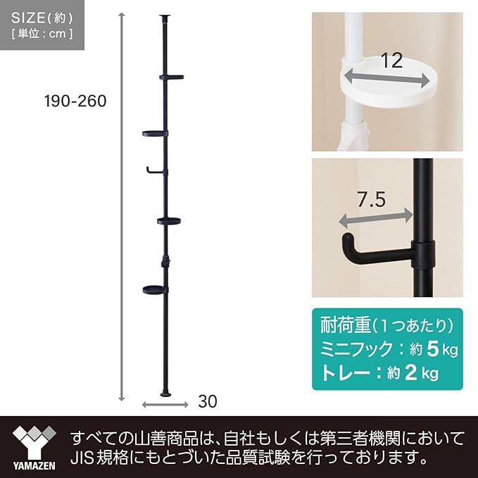 ●本体サイズ(約) : 幅30 奥行30 高さ190-260cm●丸トレーの内径 : 12cm●ミニフック直線部長さ : 7.5cm●全体耐荷重 : 約13kg(ミニフック1個あたりの耐荷重 : 約5kg、トレー1個あたりの耐荷重 : 約2kg)●材質:金属(スチール)、ポリプロピレン、ABS樹脂●表面加工 : エポキシ樹脂塗装●ミニフックの数 : 1個●トレー : 4個●東証プライム(株)山善で扱うすべての山善商品は、自社もしくは第三者機関において、JIS規格に基づいた品質試験を行っております。
