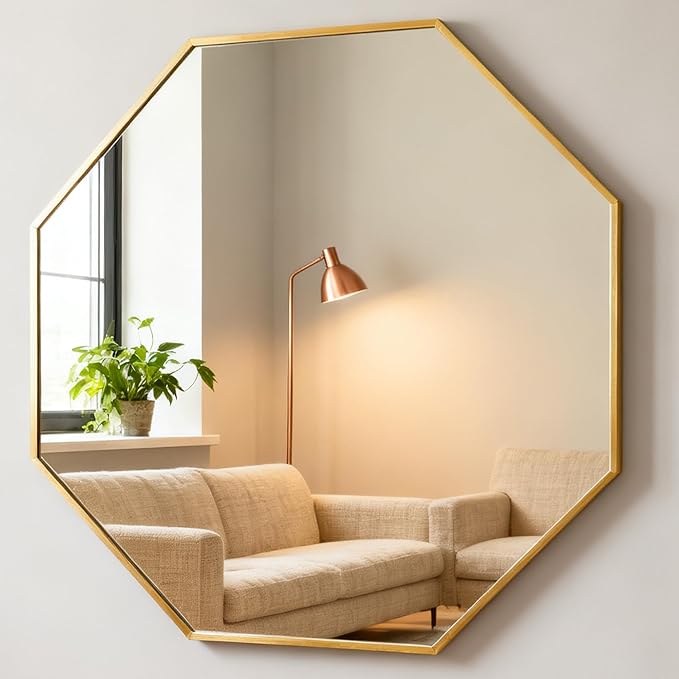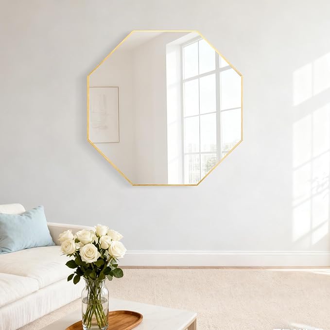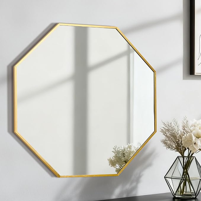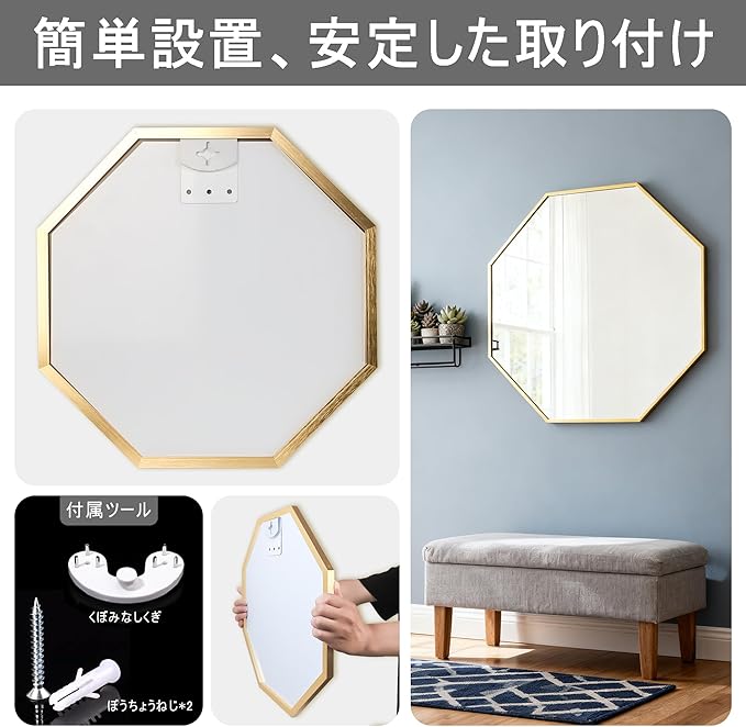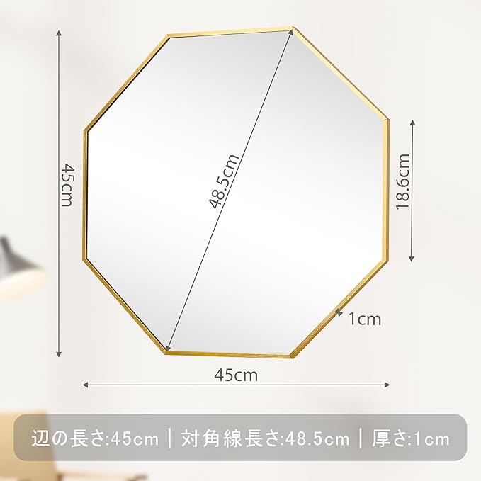 スタイリッシュな八角形のデザインは、どのようなインテリアスタイルにも溶け込み、空間のアクセントになります。軽くてサビにくいアルミニウム合金製のフレームは、長期間美しい状態を保ちます。鏡面はクリアで歪みのない写りを実現しました。